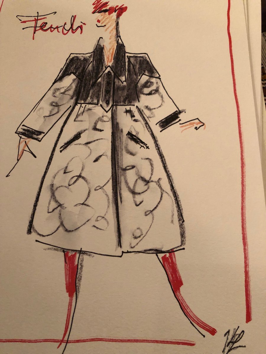 Bản sketches cuối cùng của Karl Lagerfeld thiết kế cho BST Fendi Thu/ Đông 2019 với dòng chữ kí tên phía cuối đặc trưng của ông.
