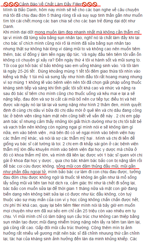 Lời cảnh báo gần nhất từ một nạn nhân tiêm chích Filler. (Nguồn: T.B.D)