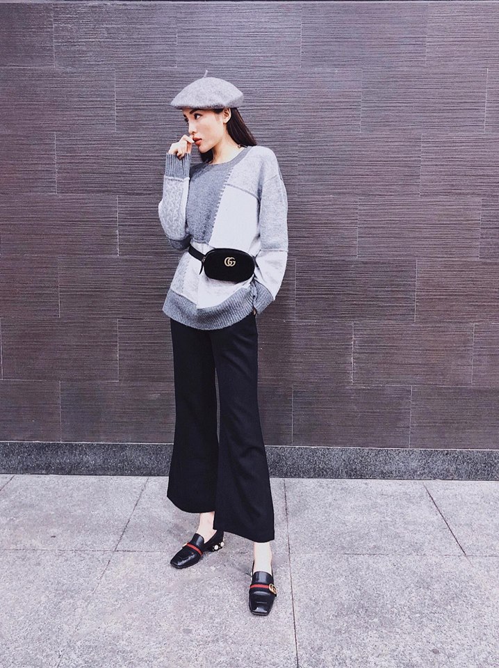 Kỳ Duyên sử dụng mũ nồi ton sur ton với áo len mềm mại khi ghé thăm thủ đô. Cô nàng cũng không quên đeo chiếc túi fanny pack của Gucci cho thêm phần sành điệu.