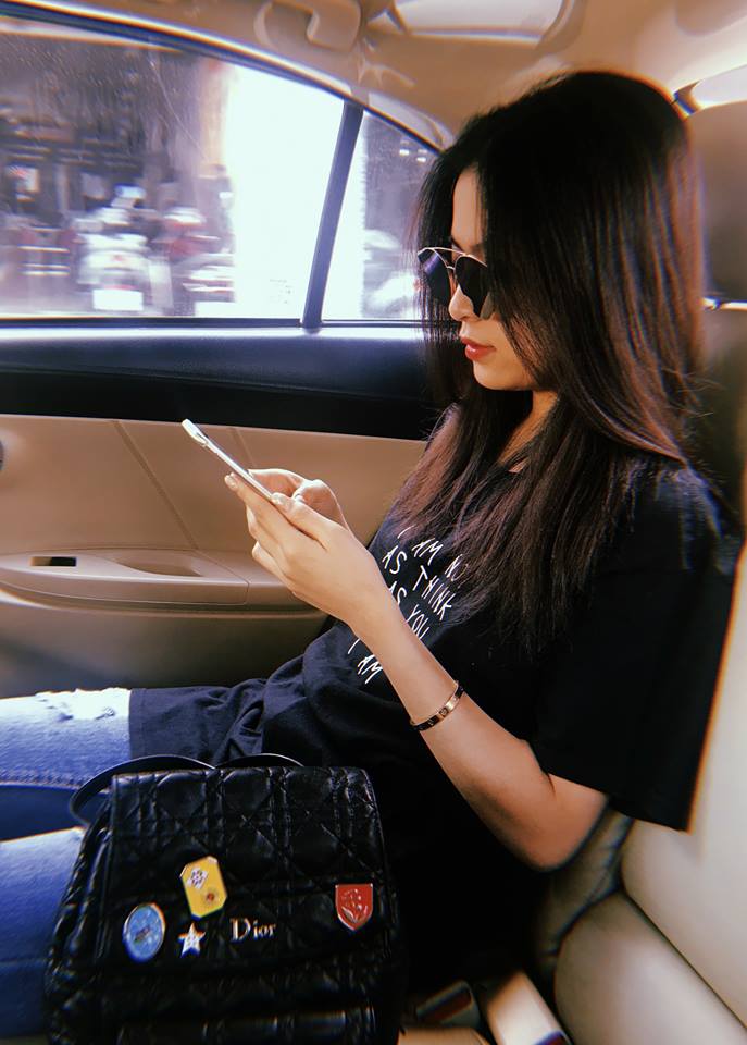 Với trang phục cực kì basic là quần jeans rách và áo thun đen, Hoàng Thùy Linh vẫn không quên sử dụng chiếc ba lô Dior mà cô rất yêu thích.