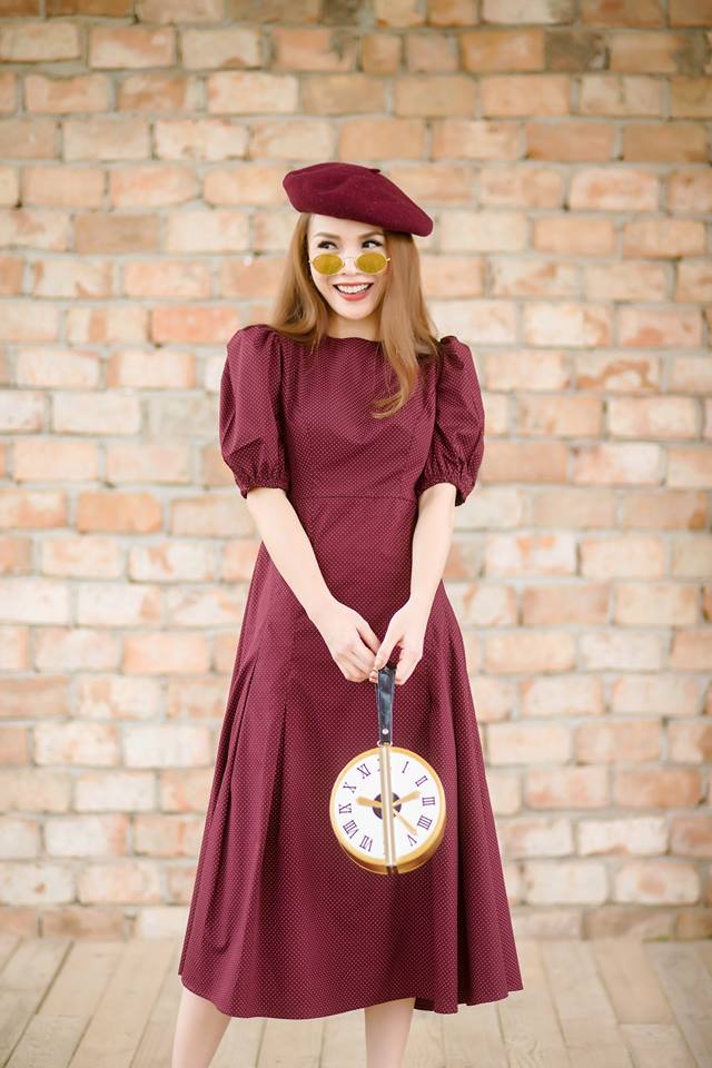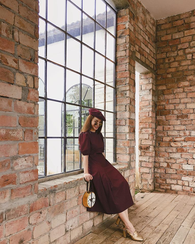 Nếu phong cách của Kỳ Duyên pha chút menswear thì Yến Trang lại hoàn toàn nữ tính khi sử dụng mũ nồi màu vang chát.