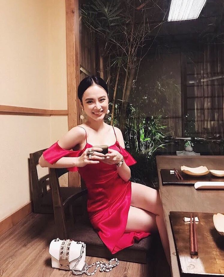 Phương Trinh diện váy hai dây đỏ rực trễ nải khoe khéo làn da trắng sứ. Bên cạnh, Phương Trịnh không quên đặt chiếc túi Valentino trắng đang “trên từng cây số” với cô nàng hiện nay.