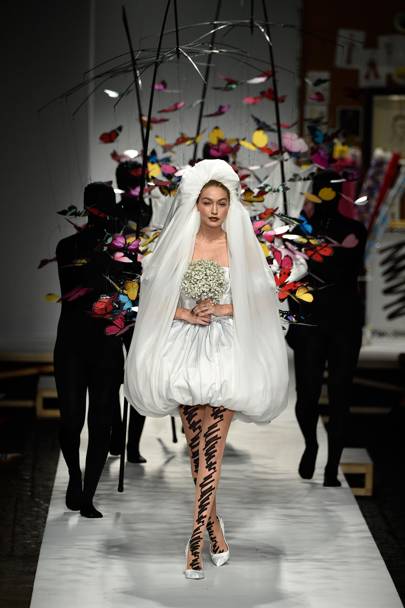 Đây là thiết kế của nhà mốt Moschino, được Gigig Hadid trình diễn với vị trí vedette.