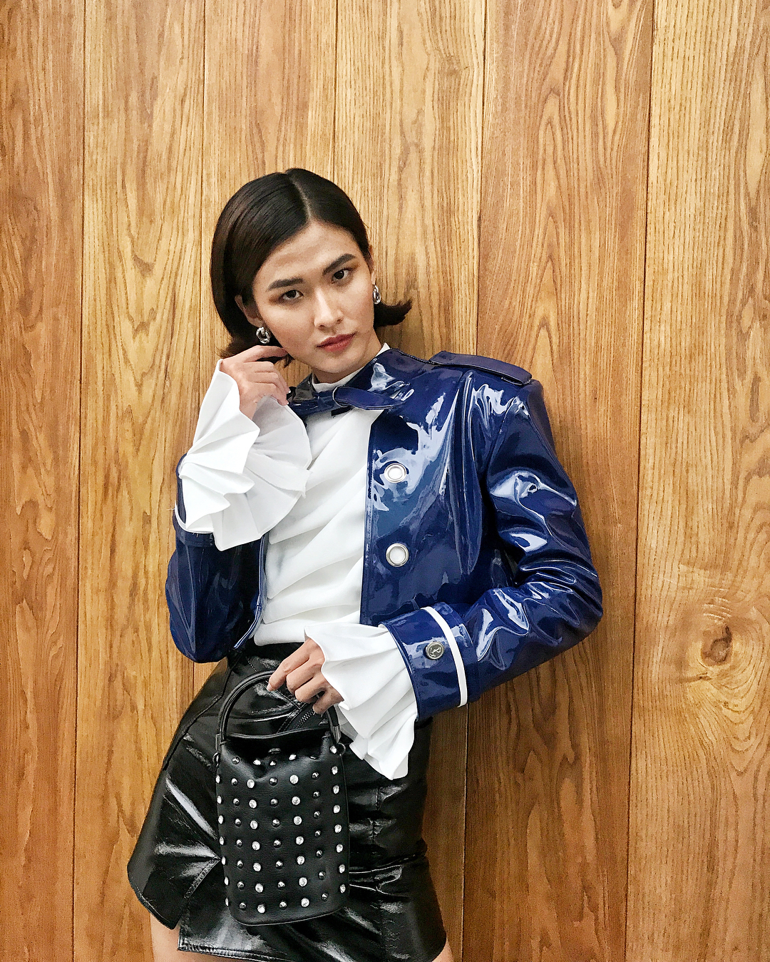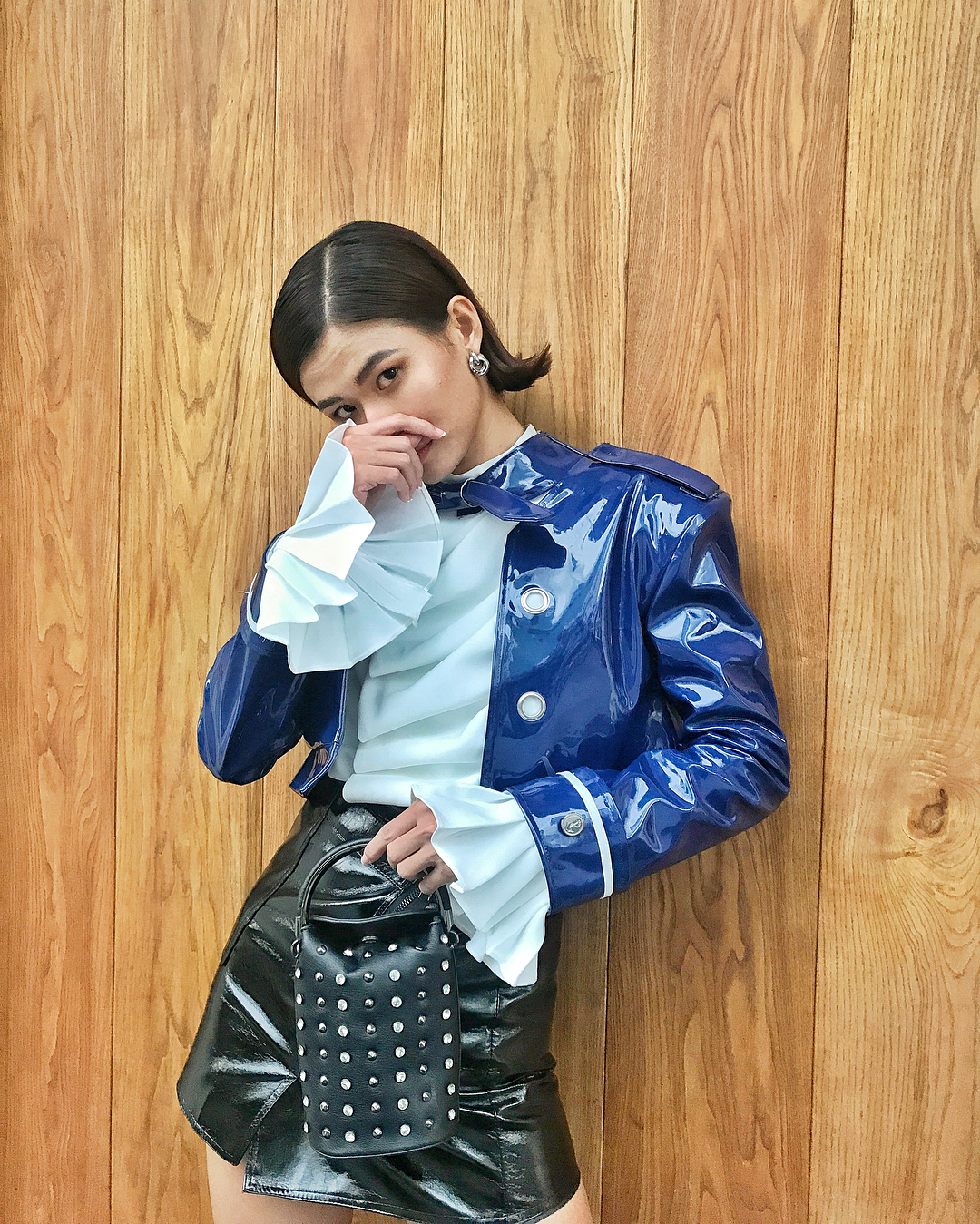 Mấy ai nghĩ áo tay chuông, xếp li nữ tính lại cực kỳ matching với áo khoác cùng chân váy da.