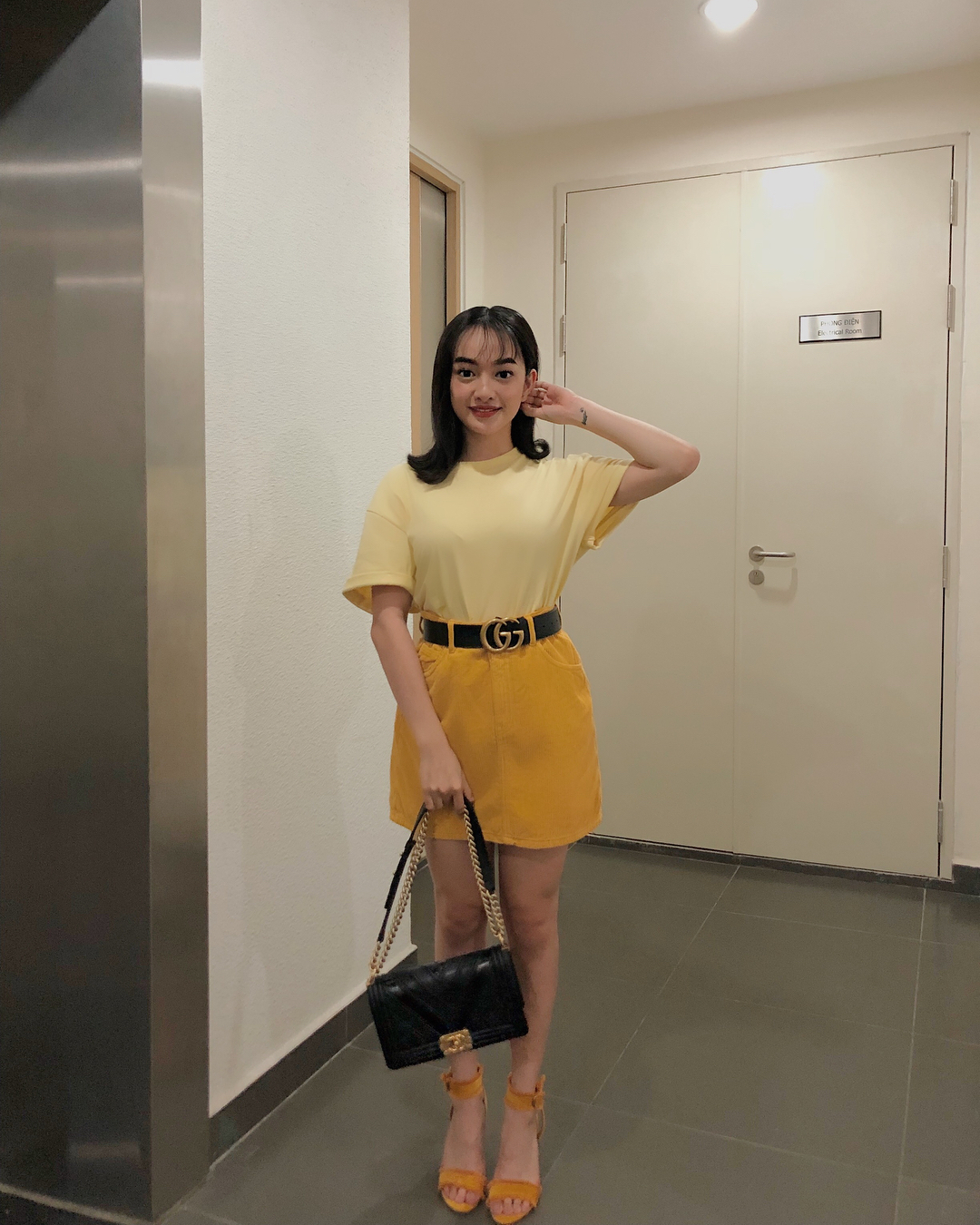 Tông màu vàng hợp mốt được Kaity Nguyễn khéo léo trưng dụng qua cách mix theo tông chuyển sắc từ đậm đến nhạt. Nữ diễn viên còn tinh tế khi phối hợp phụ kiện cùng tông.