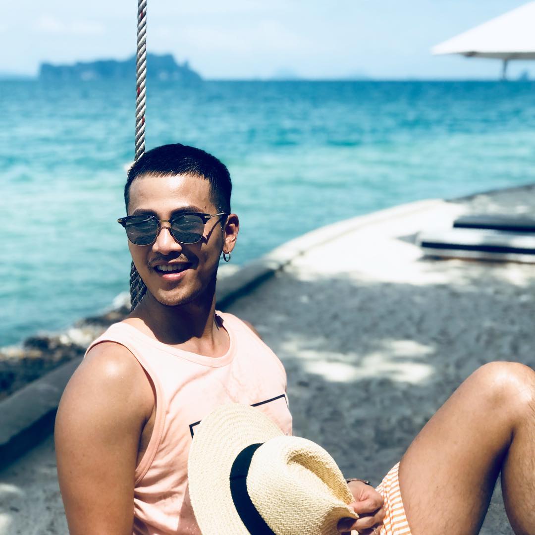 Mai Tiến Dũng đang tận hưởng một ngày thư thái bên bãi biển xanh trong. Nam ca sĩ đem đến set đồ đơn giản, năng động phù hợp với mọi chàng trai.
