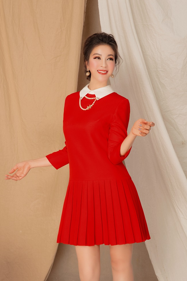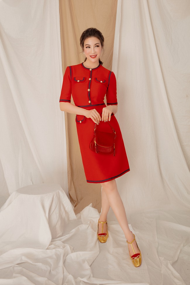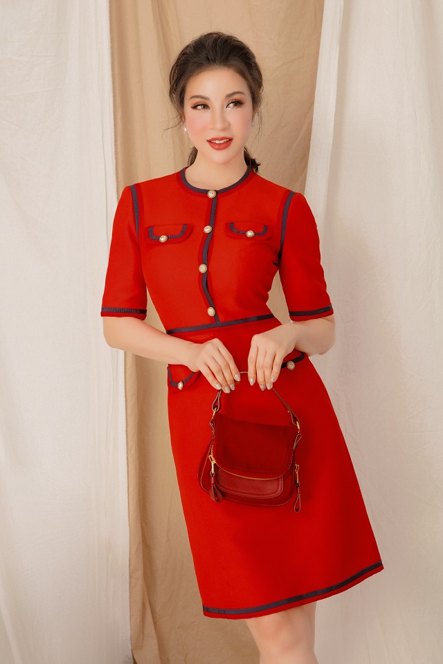 Thêm một sự lựa chọn với kiểu váy tông đỏ rực tay lửng, phom dáng ôm nhẹ mang đến diện mạo trẻ trung nhưng không kém phần thanh lịch cho phái đẹp.