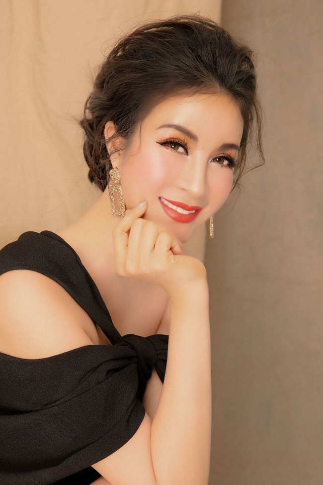 Hoa tai ngọc trai, túi xách và giày ánh vàng đồng là những phụ kiện nhấn nhá cho tổng thể của nữ MC xinh đẹp thêm cuốn hút.