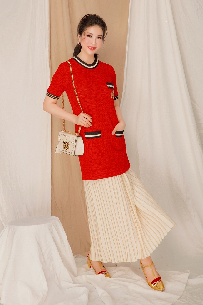 MC Thanh Mai rực rỡ với váy len đỏ dáng ngắn cùng chân váy trắng xếp ly. Để hoàn thiện set đồ, đôi giày cao gót sandals thấp cùng chiếc túi xách trắng be bé là sự lựa chọn không hề tệ