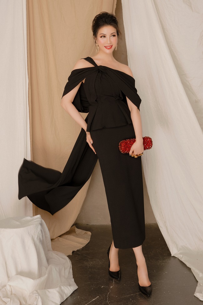 Thiết kế váy đen lệch vai dáng peplum tôn vòng eo thon gọn, kết hợp phần tà dài thướt tha, uyển chuyển theo từng bước chân người diện