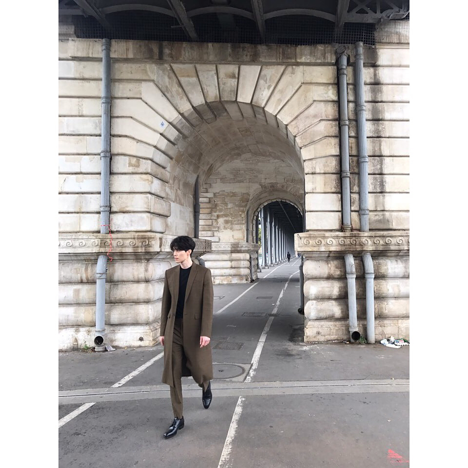 Áo khoác dáng dài cùng quần tây phối với áo thun basic khiến Dong Wook trông như một fashionisto thực thụ.