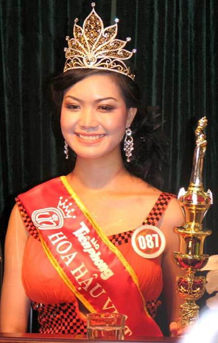 Bộ trang phục mong manh nhưng lại khiến Hoa hậu Việt Nam 2008 kém sang trọng và không khoe được đường cong trong chất liệu thô cứng.