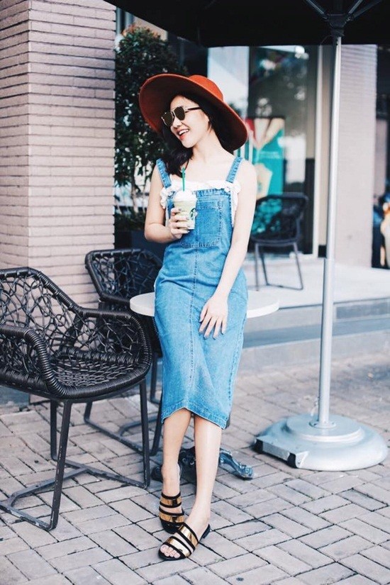 Chiếc váy yếm jeans được mix match hoàn hảo với chiếc nón vành rộng và mắt kính kiểu độc đáo.