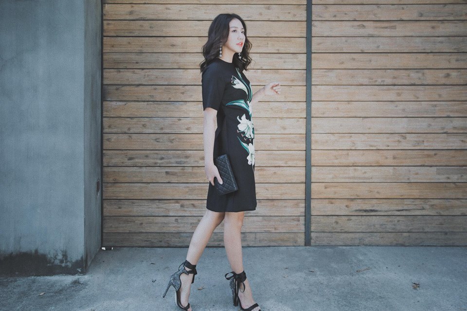 Đôi lúc cô tỏ ra thanh lịch, sang trọng như những quý cô với váy họa tiết hoa dâm bụt cùng phụ kiện mắt kính, túi xách ton-sur-ton.