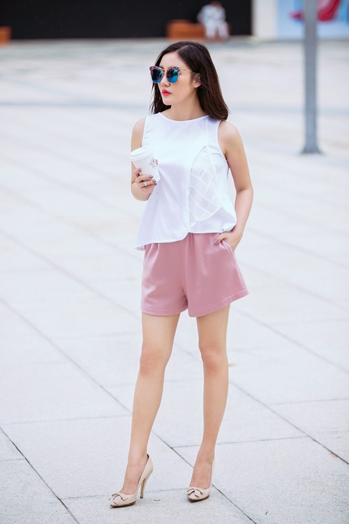 Chọn phong cách đơn giản với quần short màu pastel và áo trắng sát nách mát mẻ cũng đủ làm cô nổi bật hết phần người khác. Khi cần nữ tính dịu dàng thì một chiếc váy hồng như thế này là đủ với cô.
