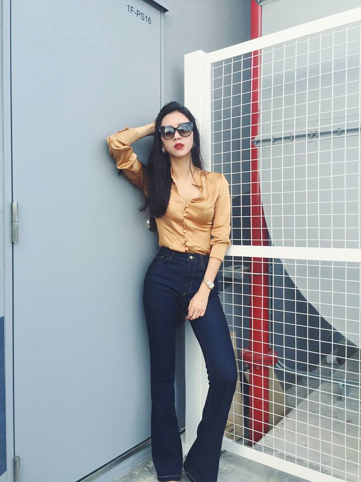 Quần jean ống rộng cùng sơ mi lụa với hàng nút dày đặt cũng là một sự kết hợp tinh tế của cô nàng.
