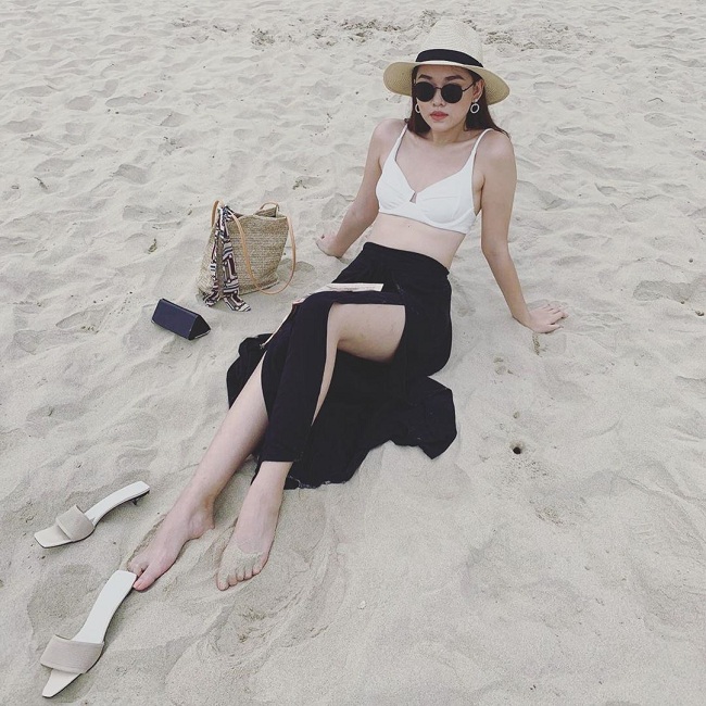 Kể cả trang phục đi biển, người đẹp cũng sẽ lựa chọn những thiết kế trắng, đen đơn giản để mix với nhau như áo bikini trắng mix cùng váy đen cắt xẻ chân cùng phụ kiện là túi xách và mũ vành chất liệu cói