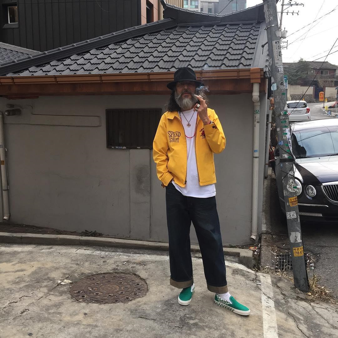 Nếu chỉ nhìn từ cổ của ông xuống thôi thì chắc chắn sẽ không ai nghĩ đây là một người đã chạm ngưỡng U60. Chiếc áo khoác vàng nổi bật xứng đôi cùng chiếc quần jean ống rộng và đôi snecker là một set đồ hoàn hảo cho ông và chắc hẳn ông sẽ khiến nhiều người cùng tuổi bị tàn đi rất nhiều.