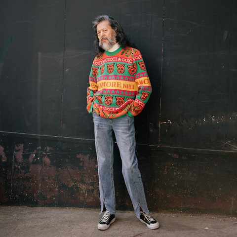 Một đôi sneaker kết hợp với chiếc quần jean xẻ gấu và chiếc áo sweater đa màu sắc này khiến ông trông thật ngầu và trẻ trung.
