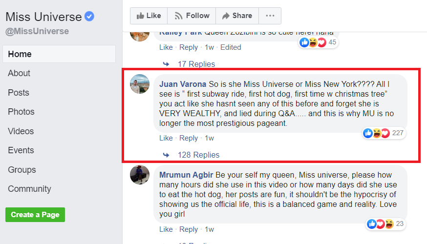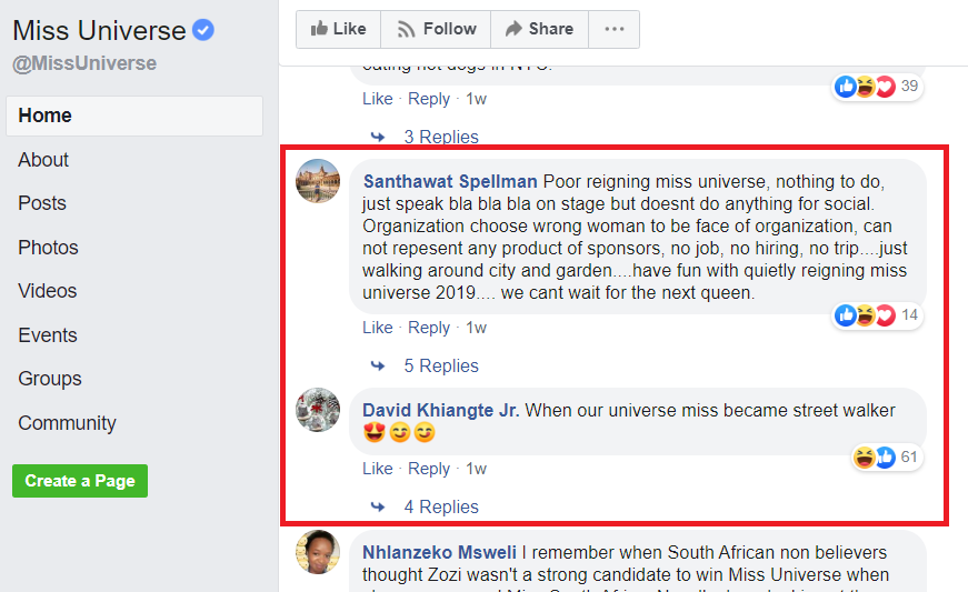 Video Zozibini Tunzi đang uống chocolate nóng được trang Miss Universe cập nhật. Ngay sau đó mọi người đều đặt ra câu hỏi “Chuyện gì đang xảy ra với Miss Universe?” và để lại bình luận phàn nàn chê bai, thậm chí là chỉ trích cô không biết làm gì ngoài những việc vô bổ.