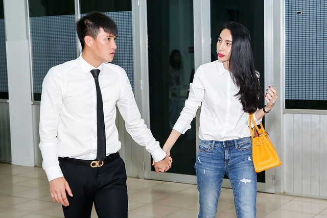 Khi đi bên vợ, Công Vinh diện nguyên bộ vest đen, vừa hợp tông với vợ, vừa thể hiện sự nam tính, lịch lãm.