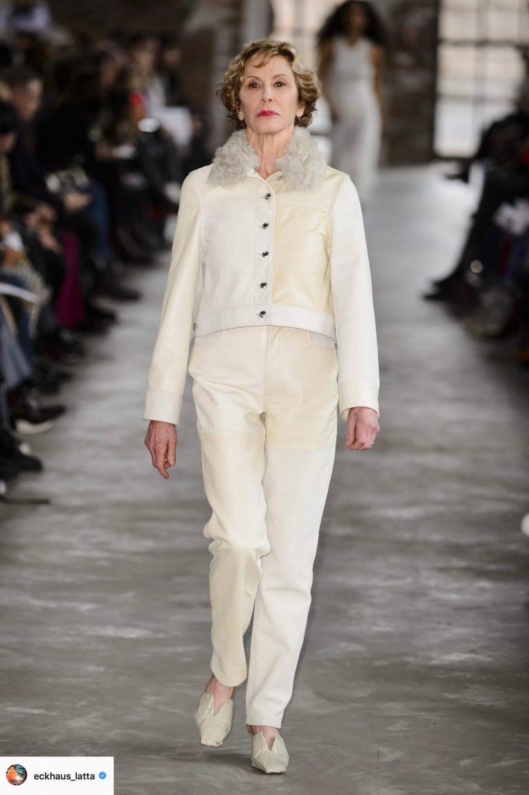 Màn catwalk của người mẫu thời trang cao tuổi Thea Westreich trong bộ sưu tập thời trang Thu - Đông 2018 của thương hiệu Eckhaus Latta.