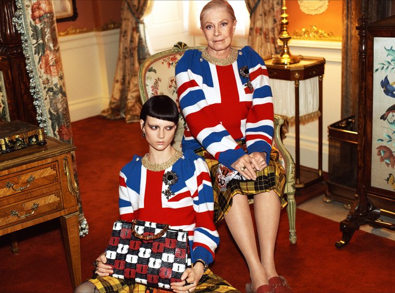 Diễn viên Vanessa Redgrave (79 tuổi) xuất hiện trên áo in quốc kỳ Anh trong chiến dịch thời trang Gucci năm ngoái.