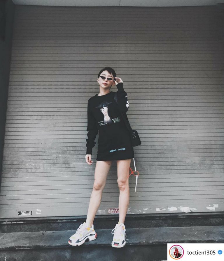 Tóc Tiên luôn biết cập nhật các xu hướng thời trang mới. Diện “cây đen” năng động, nữ ca sĩ chọn một đôi giày dad sneakers màu sắc làm điểm nhấn nổi bật cho tổng thể.
