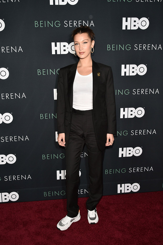 Bella Hadid được biết là một “tín đồ của các sneakers”. Cô khéo léo kết hợp đôi giày thô cùng một bộ âu phục đen trang nhã