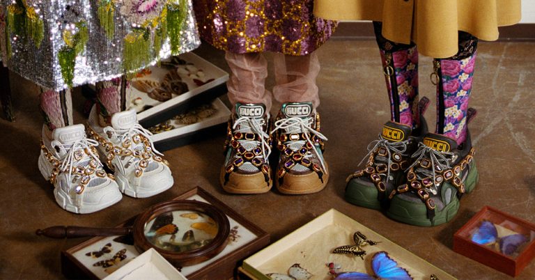 Gucci mở đầu cho sự trở lại của các mẫu dad sneakers trong mùa mốt Thu - Đông 2018 bằng những thiết kế giày “đá quý” đầy độc đáo với thiết kế đặc trưng của thập niên 80 nhưng kiểu giày mới nhất trở nên mới lạ hơn nhờ chi tiết đính đá nổi bật và màu sắc trẻ trung, hiện đại.