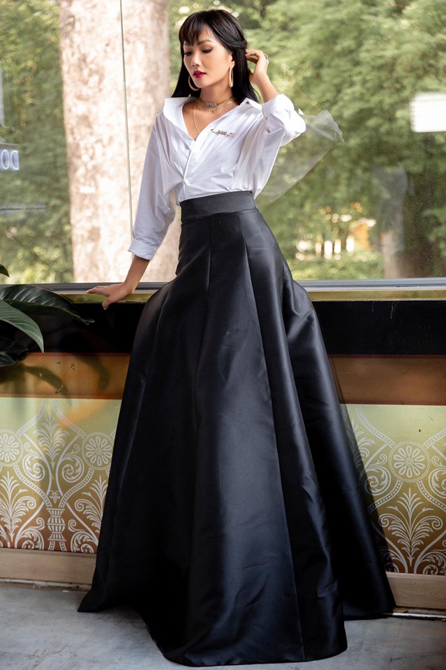 Váy đen xếp ly dài phối với áo sơ mi cách điệu, đi cùng mái tóc dài chấm ngang vai và lối trang điểm tự nhiên, tất cả tạo nên một diện mạo vừa mang hơi hướng cổ điển vừa mang nhịp đập hiện đại.