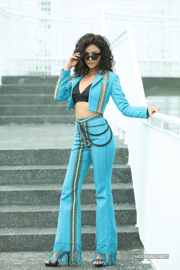 Không chỉ thay đổi kiểu tóc, người đẹp còn chọn cho mình nguyên cây hàng không thể ngầu hơn, vừa tôn vinh vóc dáng vừa làm nổi bật cá tính mạnh mẽ, phóng thoáng của cô. Được biết bộ trang phục là sự kết hợp giữa yếu tố truyền thống (chất liệu vải làm từ thổ cẩm, họa tiết đặc trưng của dân tộc Ê Đê) kết hợp với kiểu dáng hiện đại thay cho váy, khố.