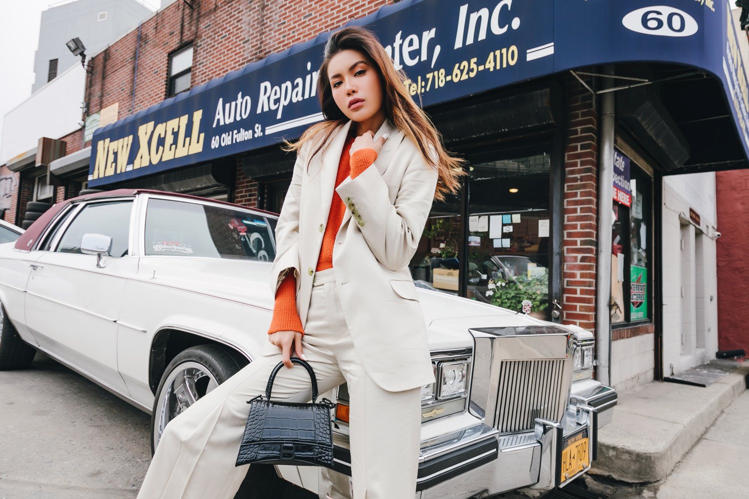 Thả dáng ở New York, Minh Tú chẳng ngần ngại diện những thiết kế cắt xẻ giữa tiết trời giá lạnh.
