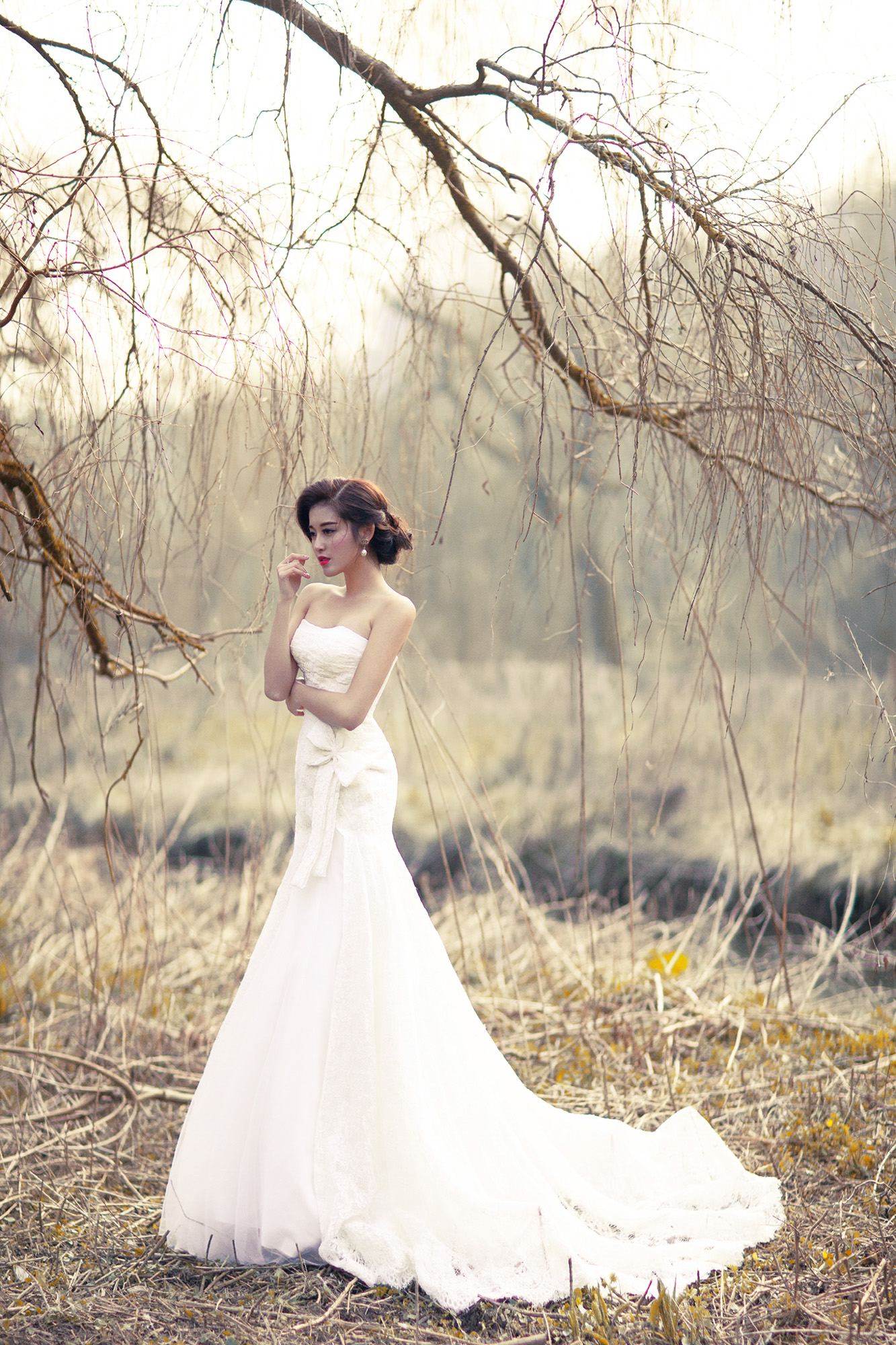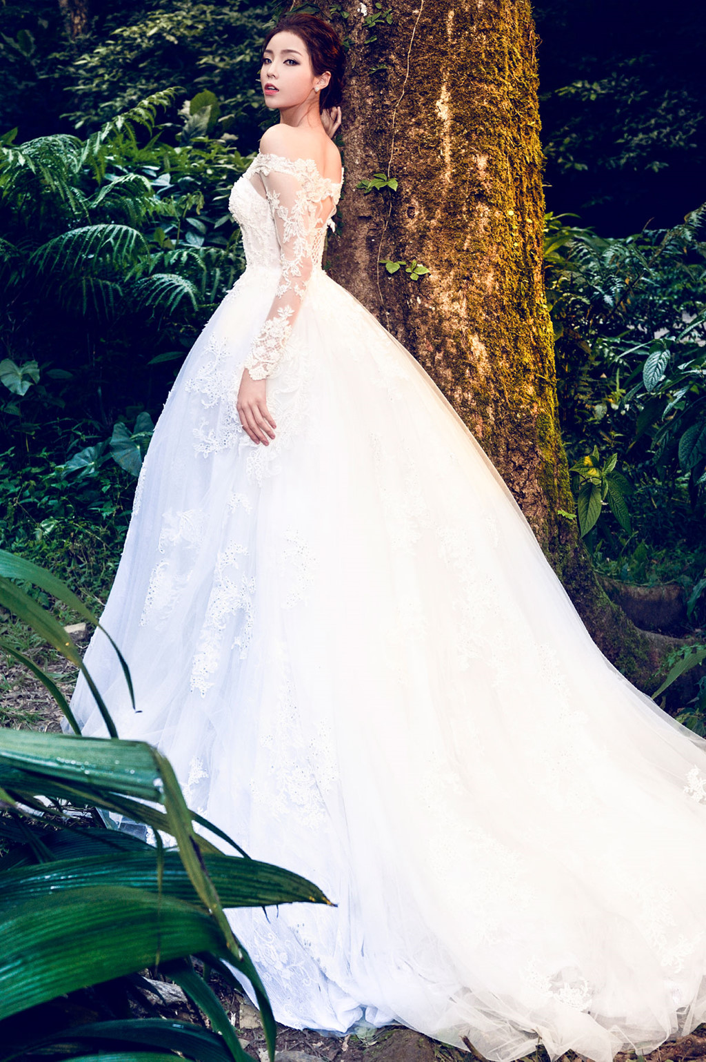 Với mẫu váy cô dâu tùng xòe rộng, trễ vai cùng thần thái mơ màng. Kiểu tóc búi ca đánh rối, hoa hậu Việt Nam 2014 trông như một nàng công chúa xinh đẹp giữa khu rừng.