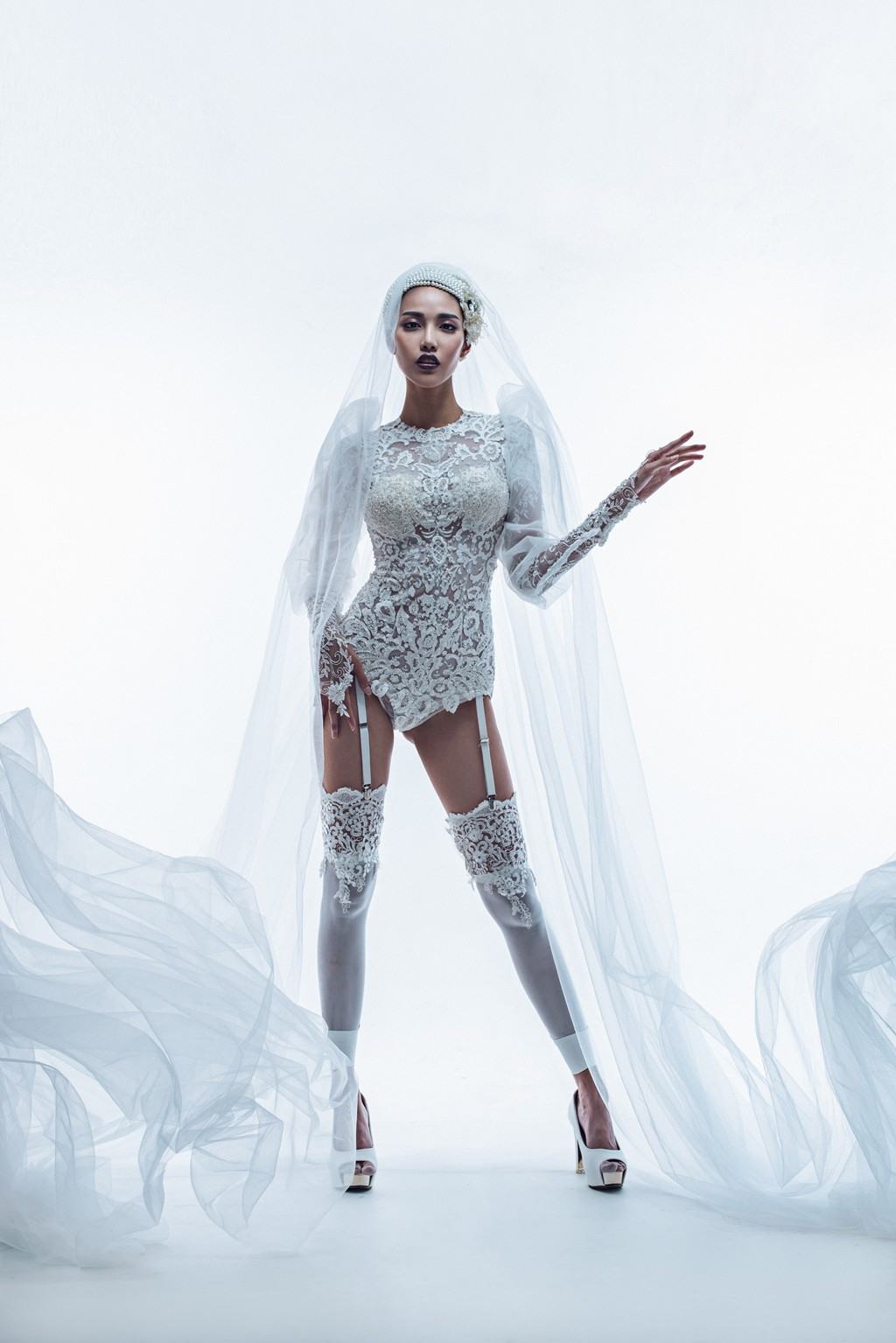 Thiết kế váy cưới với kiểu dáng cách điệu từ trang phục nội y chất liệu ren xuyên thấu kết hợp cùng băng-đô và khăn voan mang lại vẻ ma mị và quyến rũ khó cưỡng cho Hoa khôi áo dài Việt Nam.