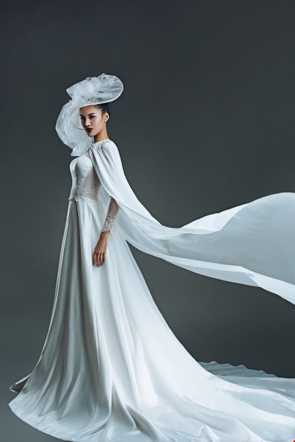 Trái ngược, vvới mẫu áo dài cưới cổ điển nhưng được biến tấu thêm áo choàng dài này, Lan Khuê đẹp một cách kín đáo nhưng đầy quyền lực.