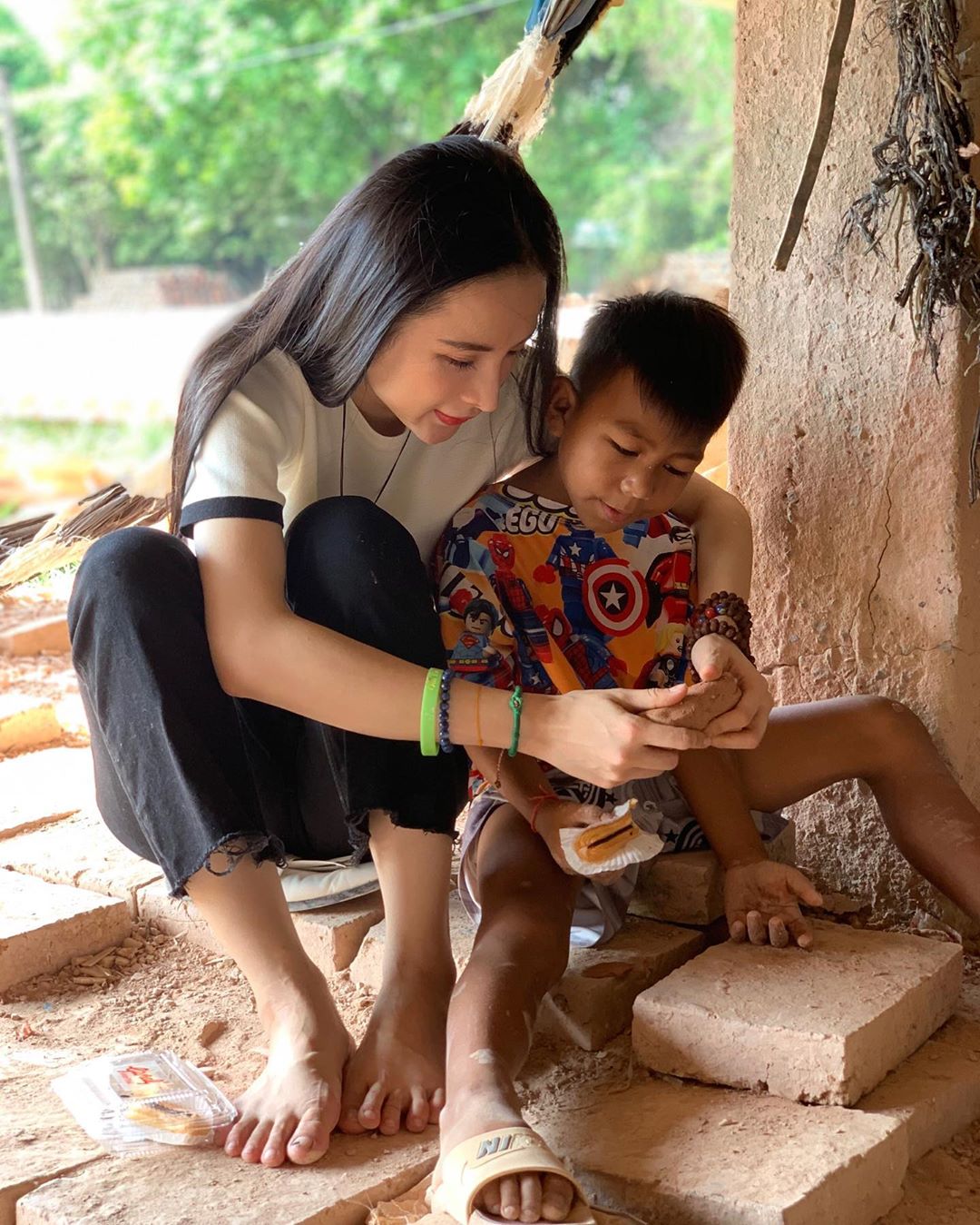Trái với hình ảnh sang chảnh trên thảm đỏ. Xuống phố hôm nay, Angela Phương Trinh đi chân trần, mang áo phông và quần tây đơn giản để phù hợp với chuyến thăm các trẻ em có hoàn cảnh khốn khó.