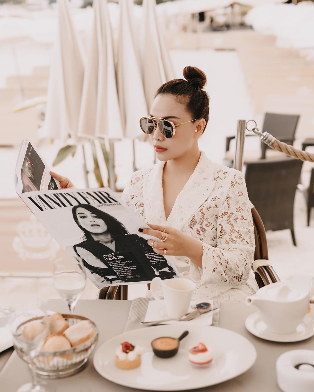 Quỳnh Thư đem đến hình ảnh sang chảnh cùng áo vest ren và kính mát bản to màu vàng đồng ấn tượng.