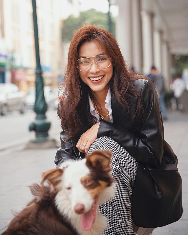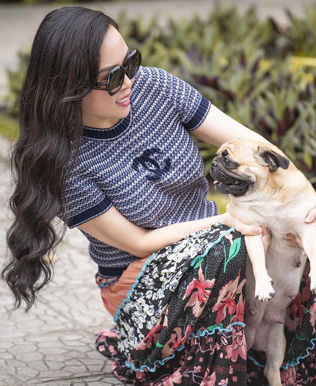 Siêu mẫu Anh Thư diện đồ đơn giản với áo hai dây lụa khi xuất hiện cùng cún cưng.