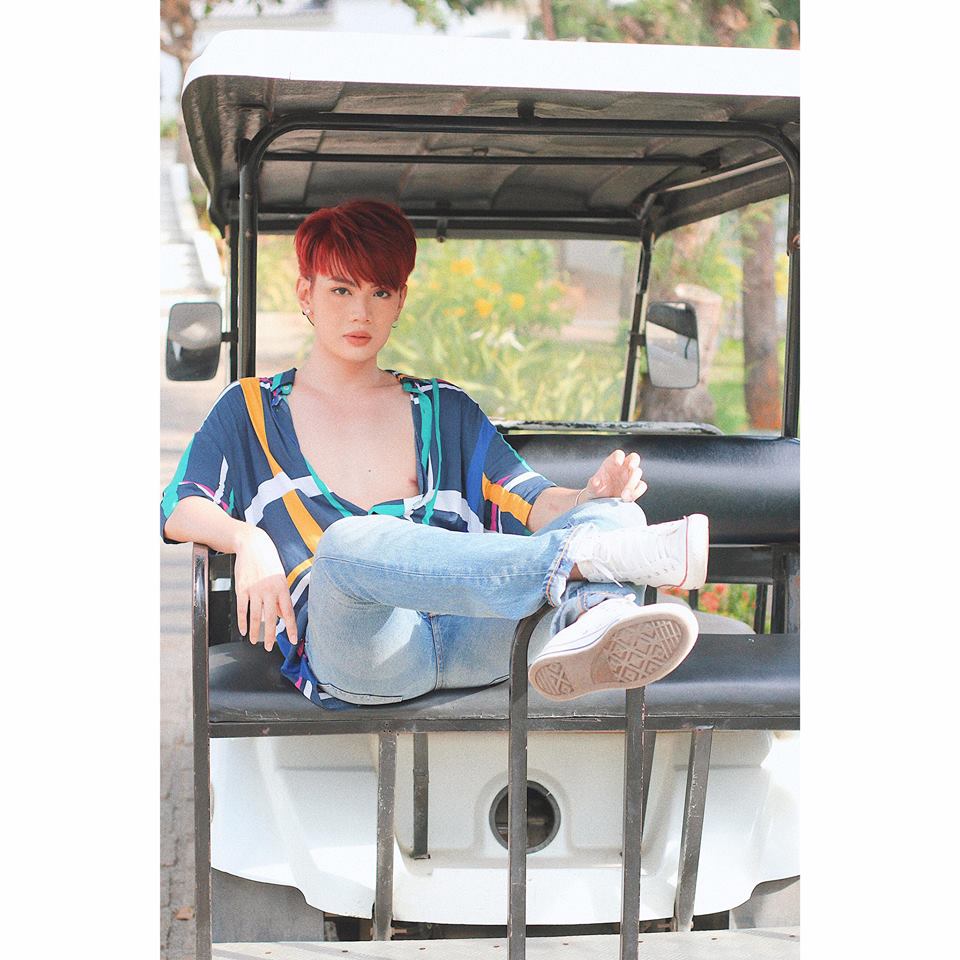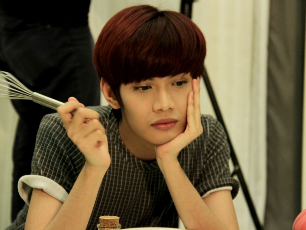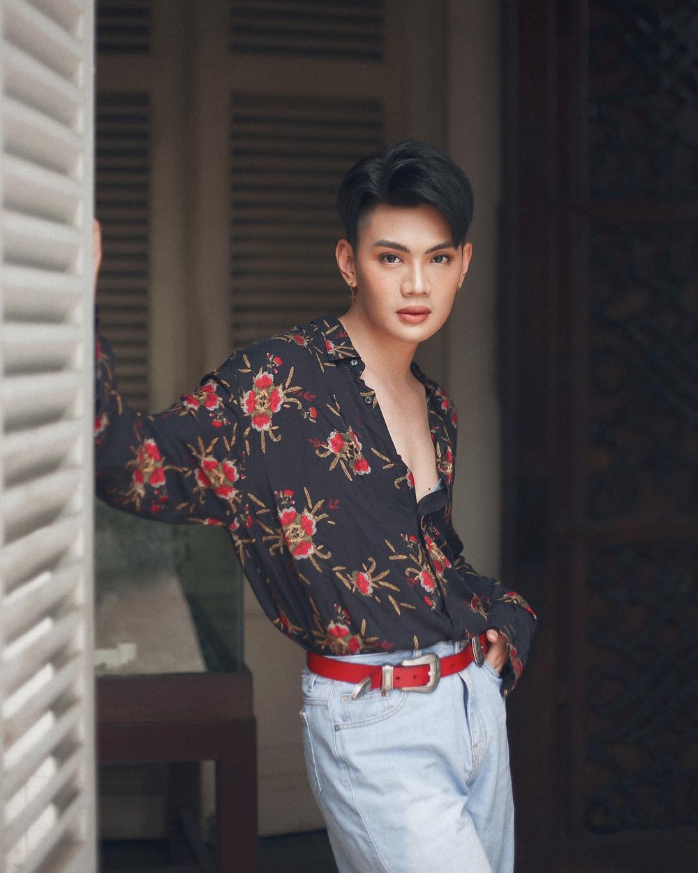 Mái tóc thư sinh được nhuộm đỏ nổi bật, đôi môi được đánh son kỹ càng trông dày lên đáng kể, ngay cả khuôn mặt cũng được Đào Bá Lộc đánh khối, kem nền cẩn thận.