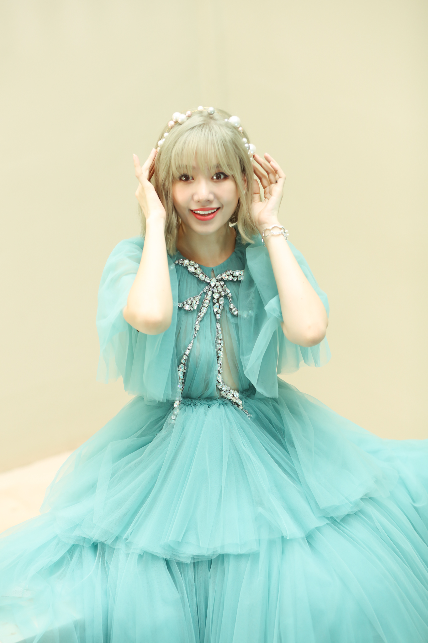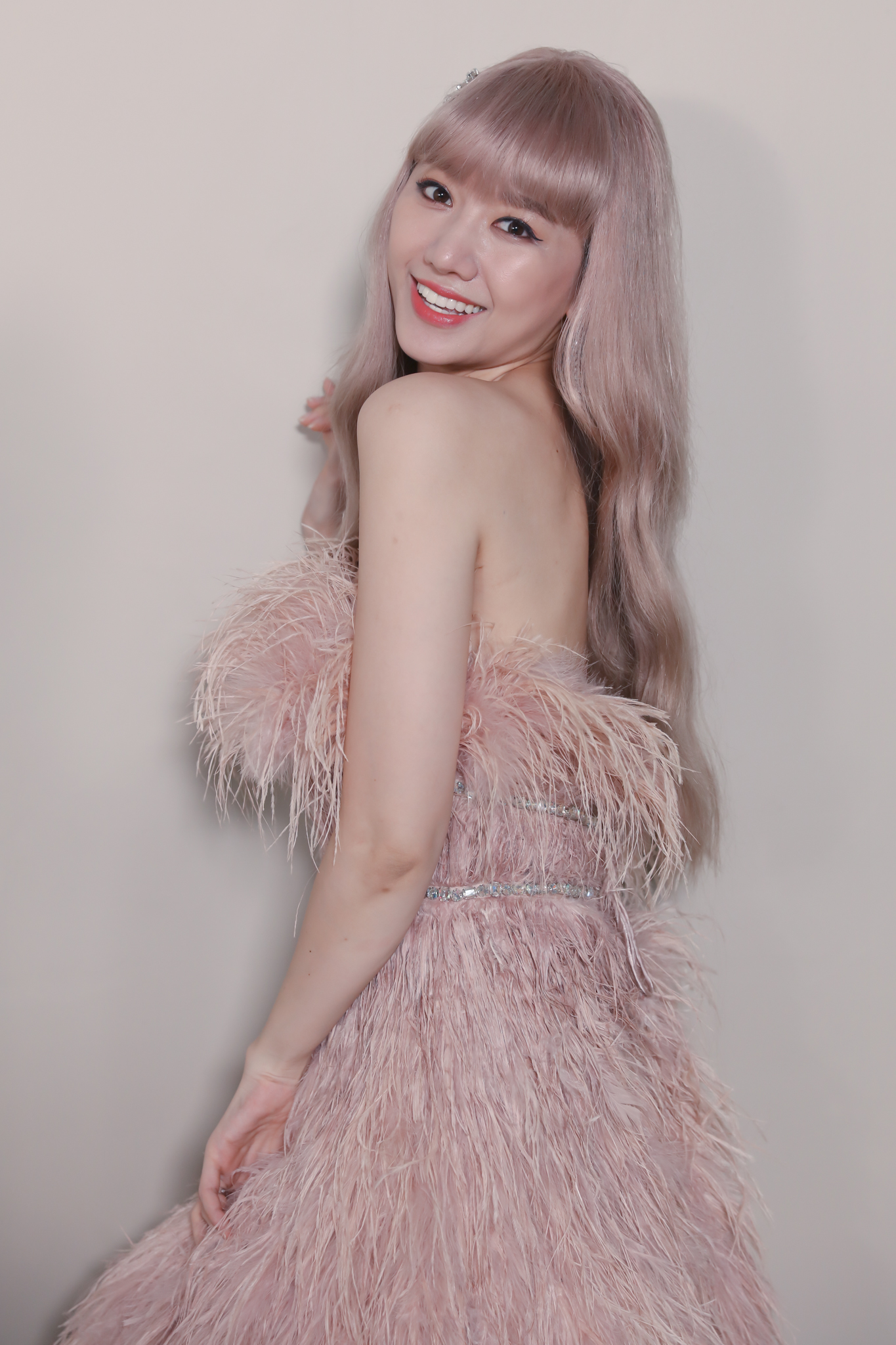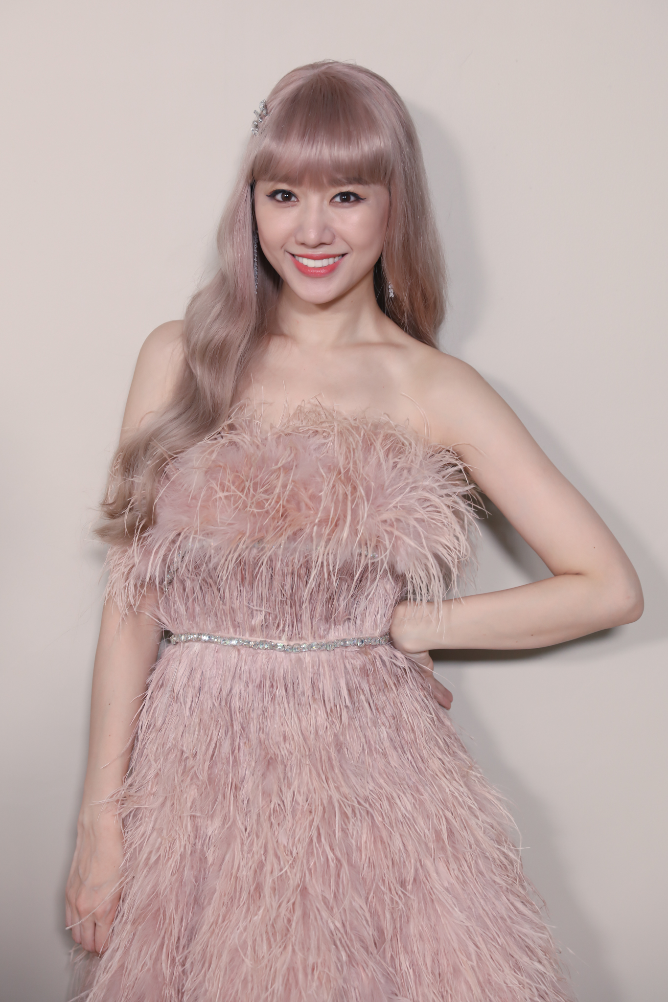 Bộ váy màu hồng nuy với thiết kế được đính hoàn toàn từ lông vũ thiên nga kết hợp pha lê ở eo được Hari đặc biệt ưa thích ngay từ lần thử trang phục đầu tiên.