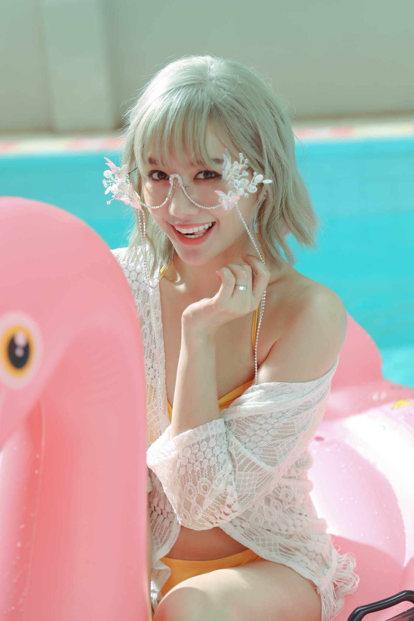 Bộ bikini sắc cam nổi bật mix cùng áo choàng ren cùng phụ kiến kính mát với hình ảnh bướm cách điệu càng làm tăng sự quyến rũ của nữ ca sĩ.