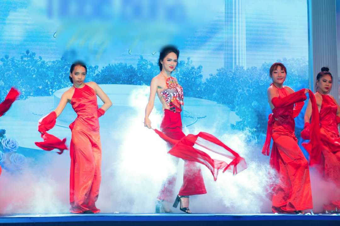Sau đó, cô tiếp tục thay một bộ cánh tông màu đỏ rực rỡ, mang cảm hứng Á Đông.