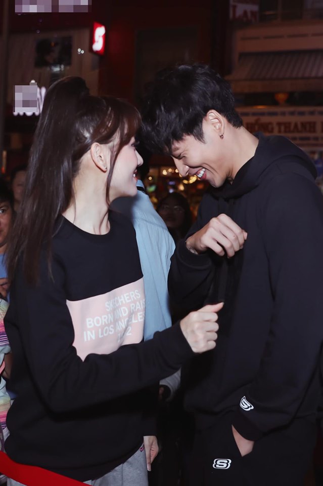 Cặp đôi thu hút sự chú ý khi diện trang phục đồng điệu. Trong đó, nếu giọng ca “Anh cứ đi đi” khoe vóc dáng thon gọn khi phối quần short thun với áo hoodie, kiểu tóc cột cao, dáng điệu trẻ trung như gái 18 thì Tuấn Trần hướng đến hình tượng lạnh lùng với “cây đen” gồm áo hoodie và quần thể thao tối màu. Đặc biệt, cả hai khéo léo tạo điểm nhấn với giày thể thao màu sắc nổi bật.