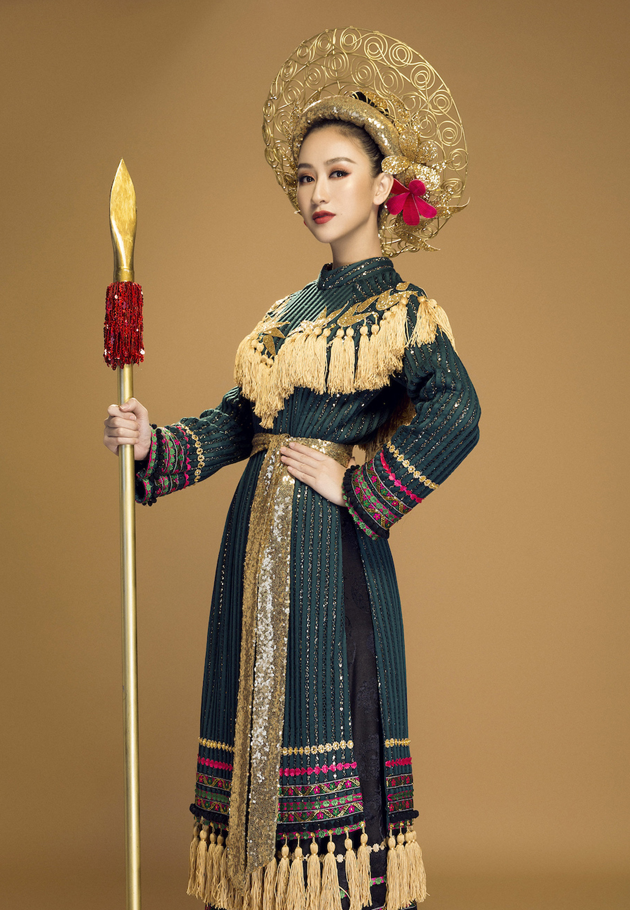 Phần váy sử dụng gấm - một chất liệu truyền thống của Việt Nam - kết hợp cùng những hoa văn của dân tộc tạo nên một tổng thể bao hàm trọn vẹn cả một Việt Nam. Bộ trang phục được điểm xuyến phụ kiện được làm 100% bằng tay. Điểm nhấn còn có thêm chiếc mấn đội đầu được làm bằng kẽm và phủ sơn đồng.