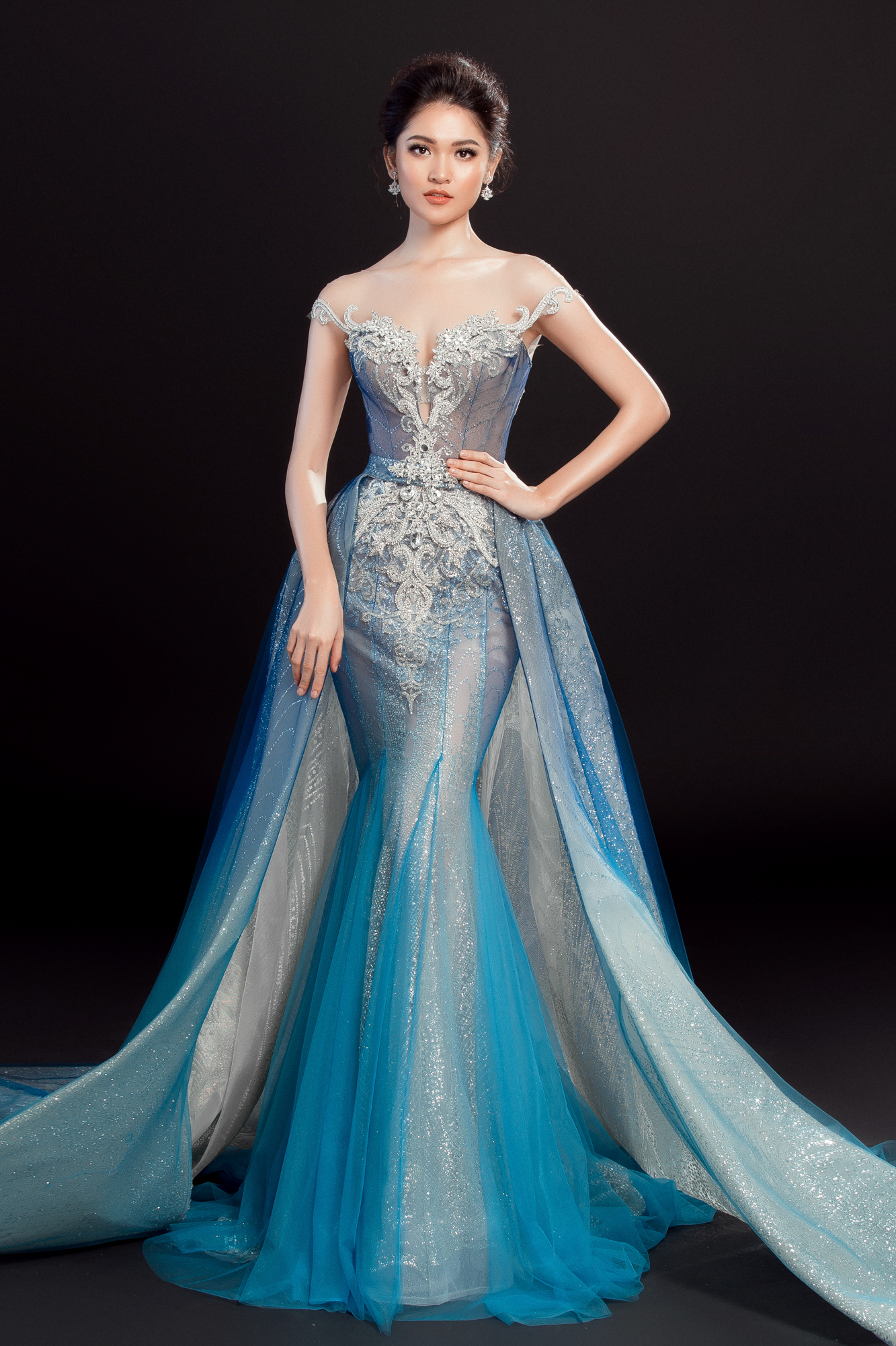 Chọn đầm dạ hội màu xanh ombre chuyển sắc, Á hậu Thùy Dung khéo léo khoe đường cong cơ thể bằng thiết kế đuôi cá, ôm sát. Phần váy choàng phía ngoài giúp Thùy Dung lộng lẫy khi di chuyển nhưng không kém phần sang trọng, tinh tế như một nữ hoàng sắc đẹp.