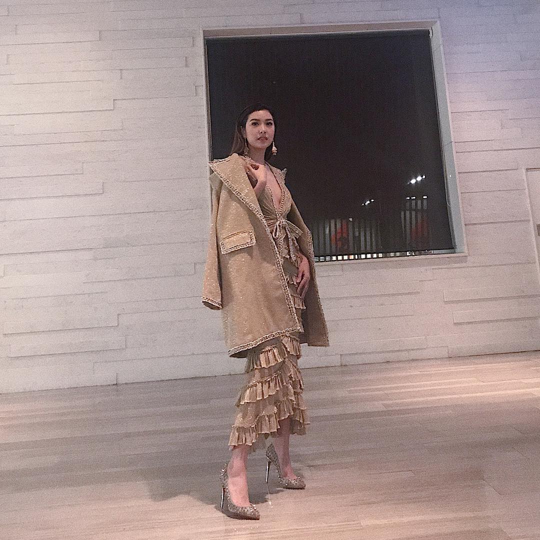 Minh Triệu cũng có lần mặc thiết kế này, mặc đầm bèo nhún tầng khoét cổ sâu gợi cảm đến thế nhưng trông cô vẫn vô cùng cá tính.