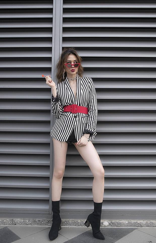 Thiều Bảo Trang vẫn luôn cá tính và phối đồ cao tay. Chỉ cần điểm nhấn là chiếc thắt lưng đỏ to bản và cặp kính đang siêu hot, Thiều Bảo Trang đã đủ nổi bần bật trên phố.