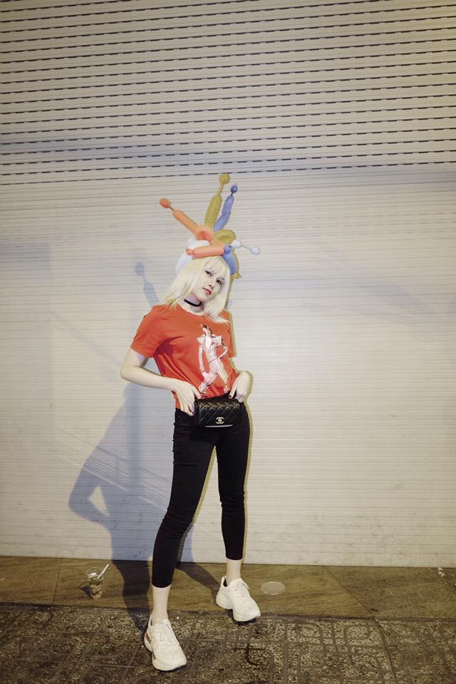 Cô em gái Thiều Bảo Trâm cũng không kém cạnh khi diện áo thun đỏ tinh nghịch kết hợp cùng đôi sneaker Gucci đang hot.