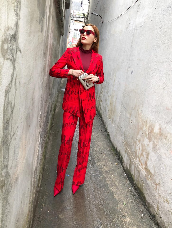 Không diện áo dài đỏ như đa số các sao nữ khác, Kỳ Duyên diện một cây suit đỏ rực nổi bần bật trong ngày đầu năm. Bộ suit phù hợp với phong cách menswear cá tính mà lịch lãm Kỳ Duyên đang theo đuổi. Thiết kế của Adrian Anh Tuấn được Duyên kết hợp với phụ kiện kính đỏ và boots cùng tông của Balenciaga